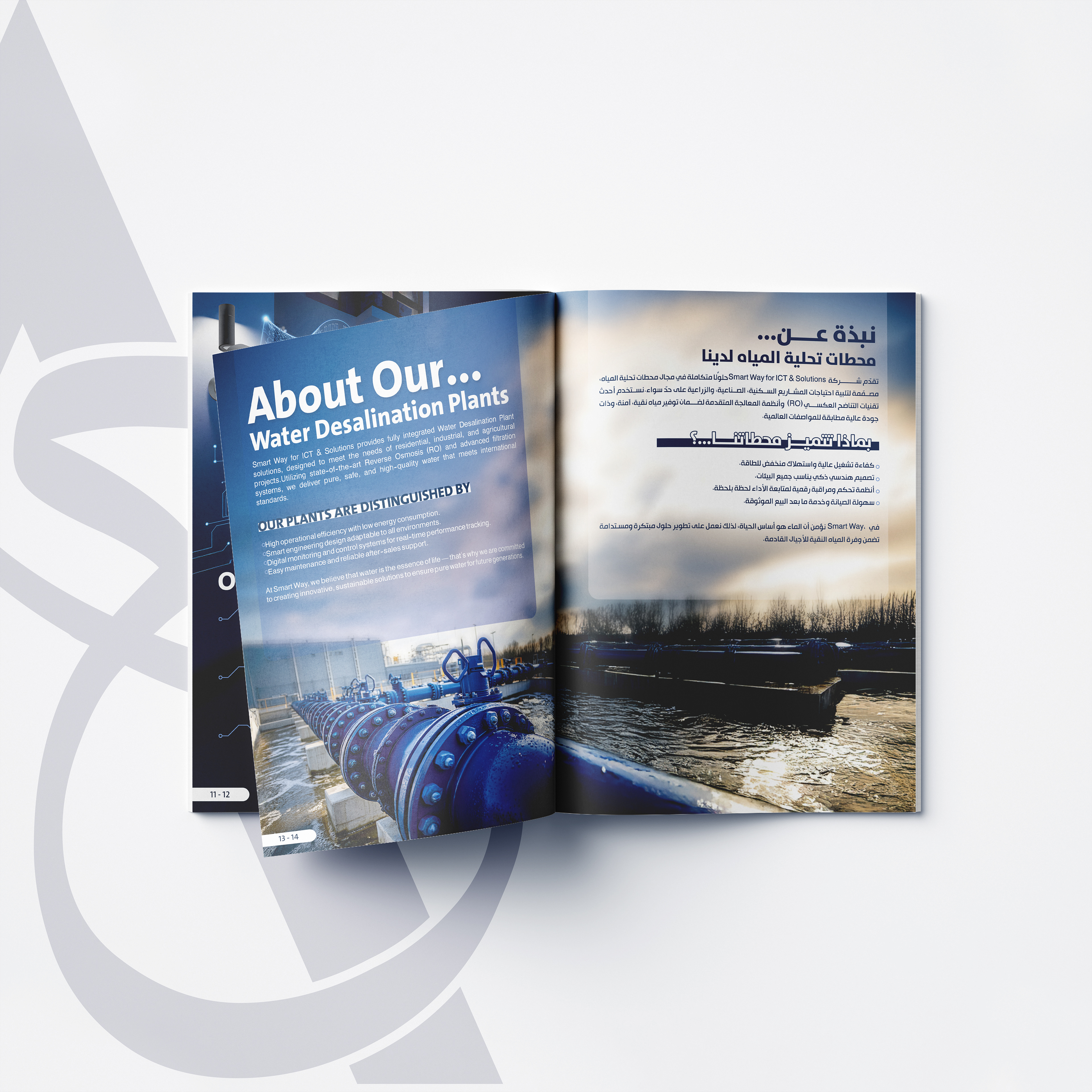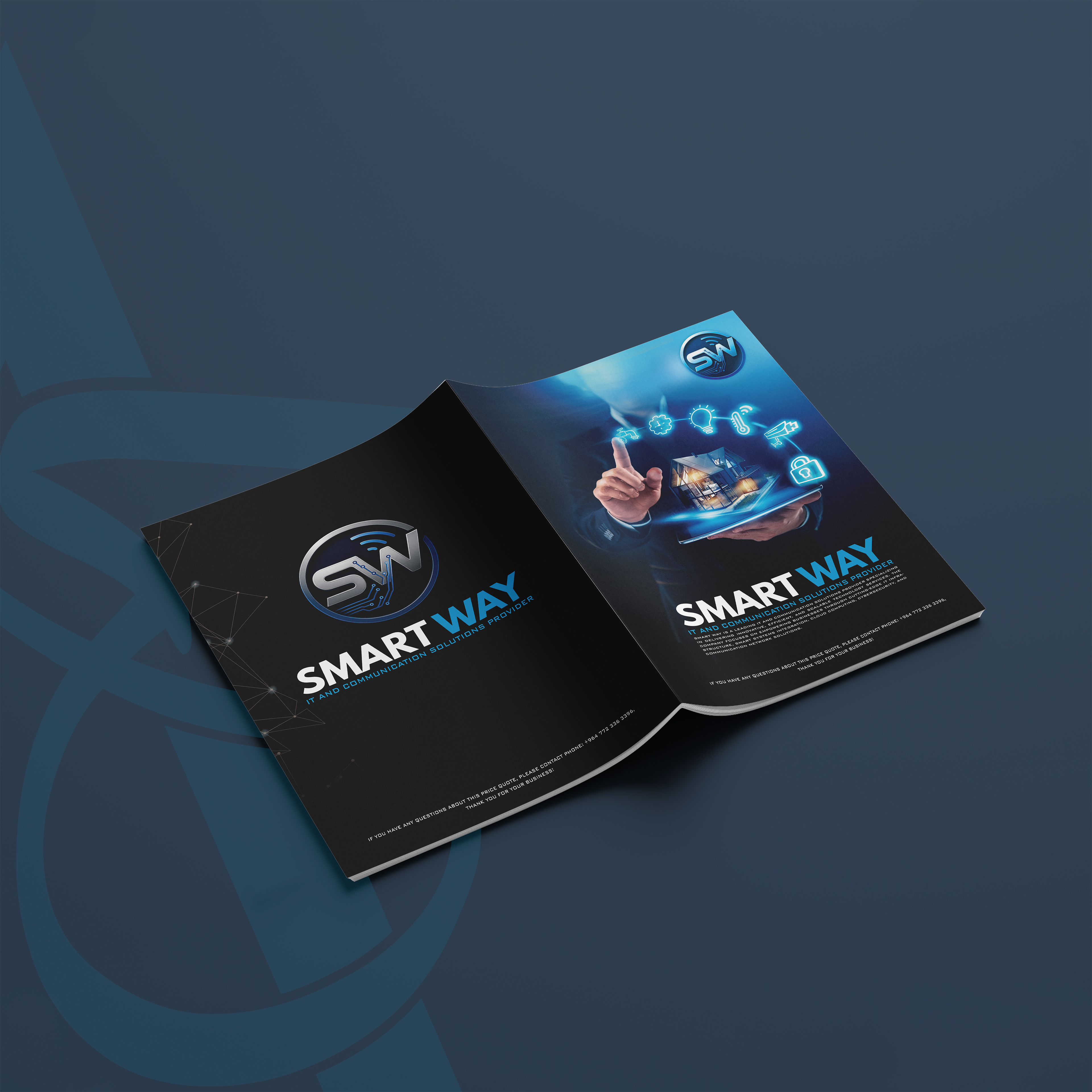 The Challenge | Designing a corporate profile for Smart Way, a company specializing in advanced IT infrastructure, communication solutions, and industrial smart systems (including water desalination automation). The challenge was to visualize "invisible" services like software, AI, and security in a tangible way. The client needed a look that feels futuristic, secure, and innovative, distinguishing them from traditional service providers.