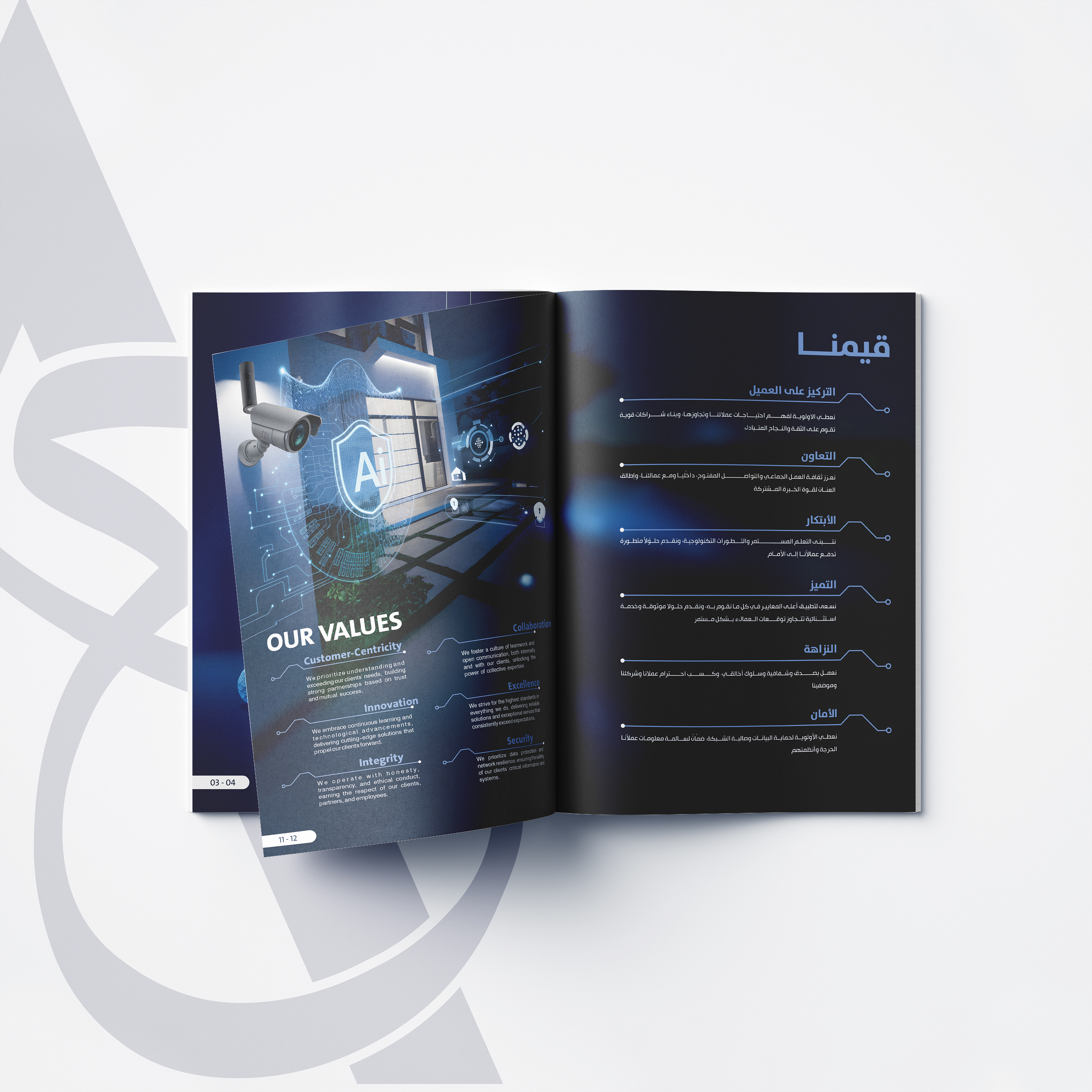 The Solution | I adopted a "Dark Mode" aesthetic (Deep Blue & Black) to reflect the high-tech nature of the industry. The design uses glowing light effects and digital connection lines to symbolize data flow and connectivity. I used distinct iconography (Shields, CCTV, AI chips) to break down their values and services visually. The layout is structured to handle technical information clearly without overwhelming the reader.